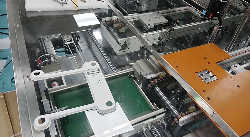 2.2、抓取機(jī)構(gòu)將彈片精確地搬運(yùn)到人體秤工件(通常是裝配有電池盒或PCB板的秤體/底殼)的預(yù)定安裝位置上方。